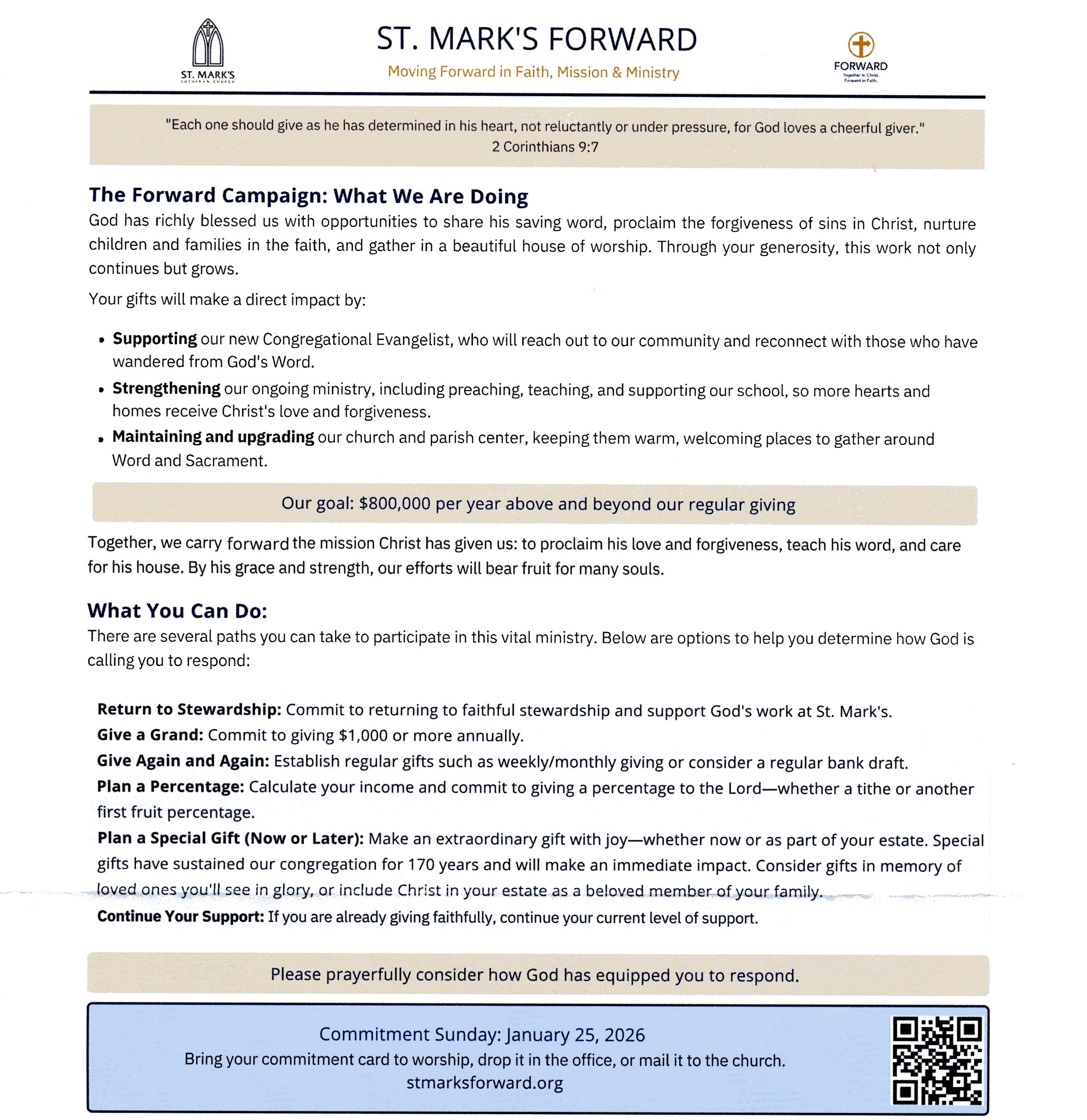 The Forward campaign was a main focus of the July Voters' meeting, with the 5-year funding plan outlined and proposed disbursement plan approved by the voters. As the first pillar of the new campaign, Mr. David Hochmuth’s work as St. Mark’s congregational evangelist has begun.